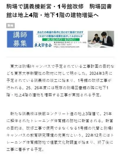 根據日媒報道,大一、大二新生要待的東京大學駒場校區,目前正在進行一系列大型建築工程…