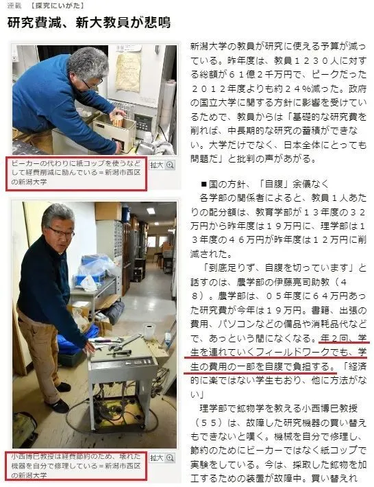 新瀉大學的小西教授,用紙杯代替燒杯,親自修理損壞的設備,似乎連教育必需的設備都無法正常使用。農學院助理教授伊藤良二被迫自掏腰包做科研…