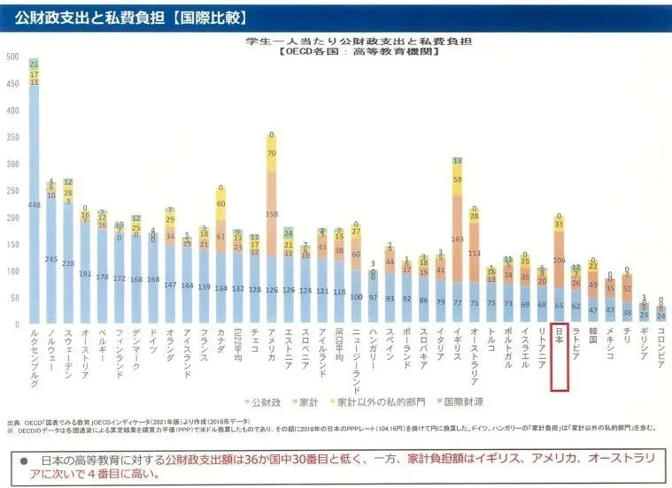 根據2009年的數據顯示,日本的學校教育公共支出按照國際標準來看也是遠遠落後,在36個經合組織成員國中排名第30位,倒數的。