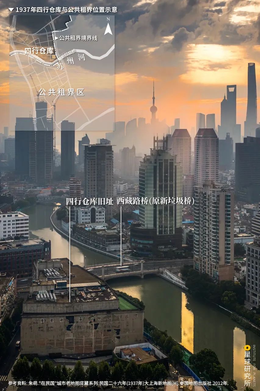 蘇州河的兩岸曾是地獄和天堂。其****北岸的四行倉庫因坐落在公共租界外,而成為了抗戰時期上海最慘烈的戰場之一|圖片來源@視覺中國,製圖@高儷倩/星球研究所