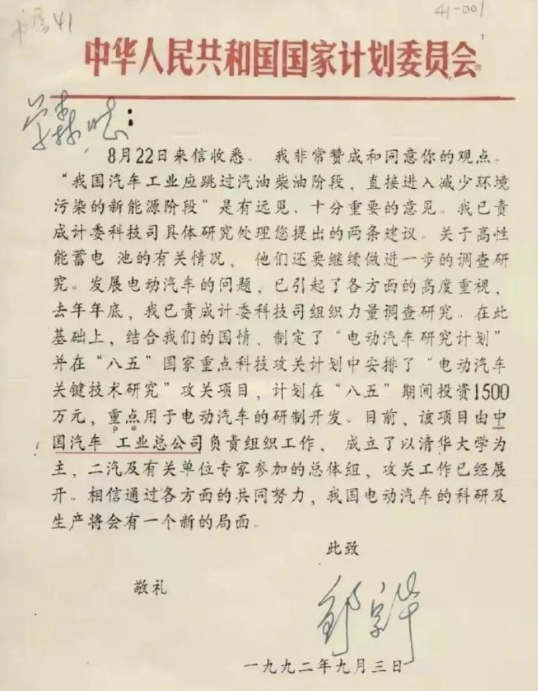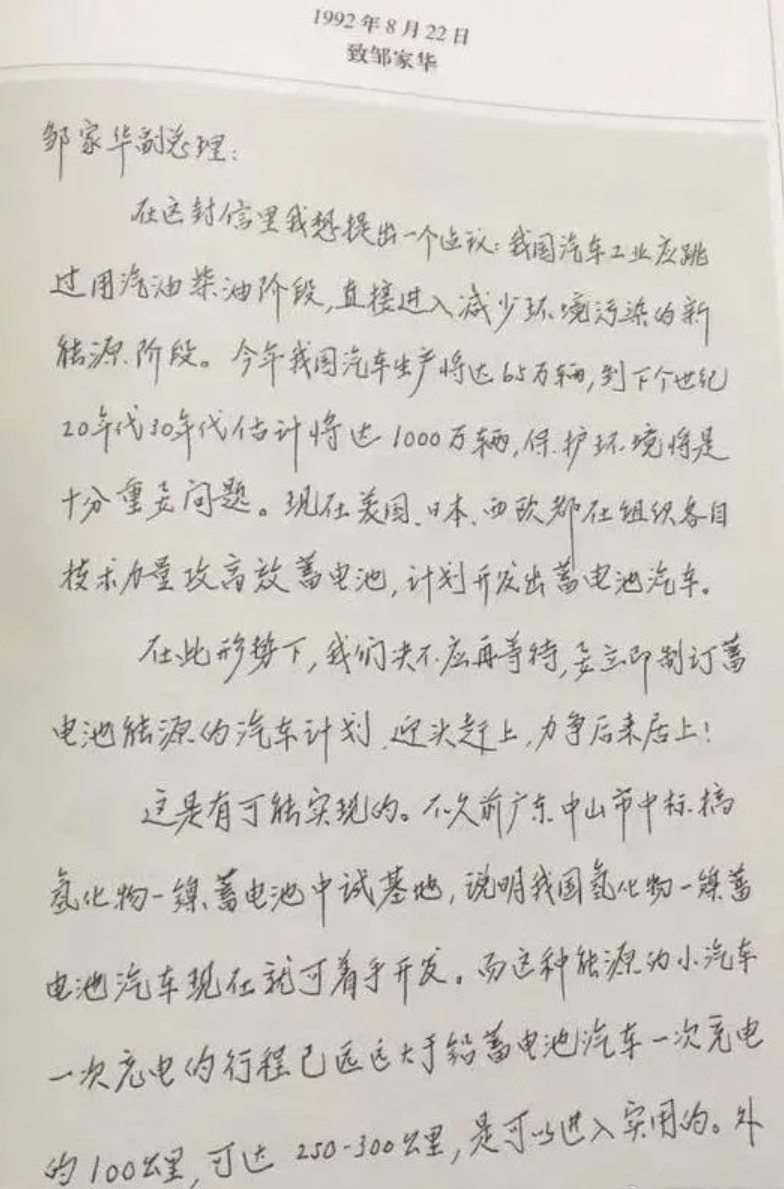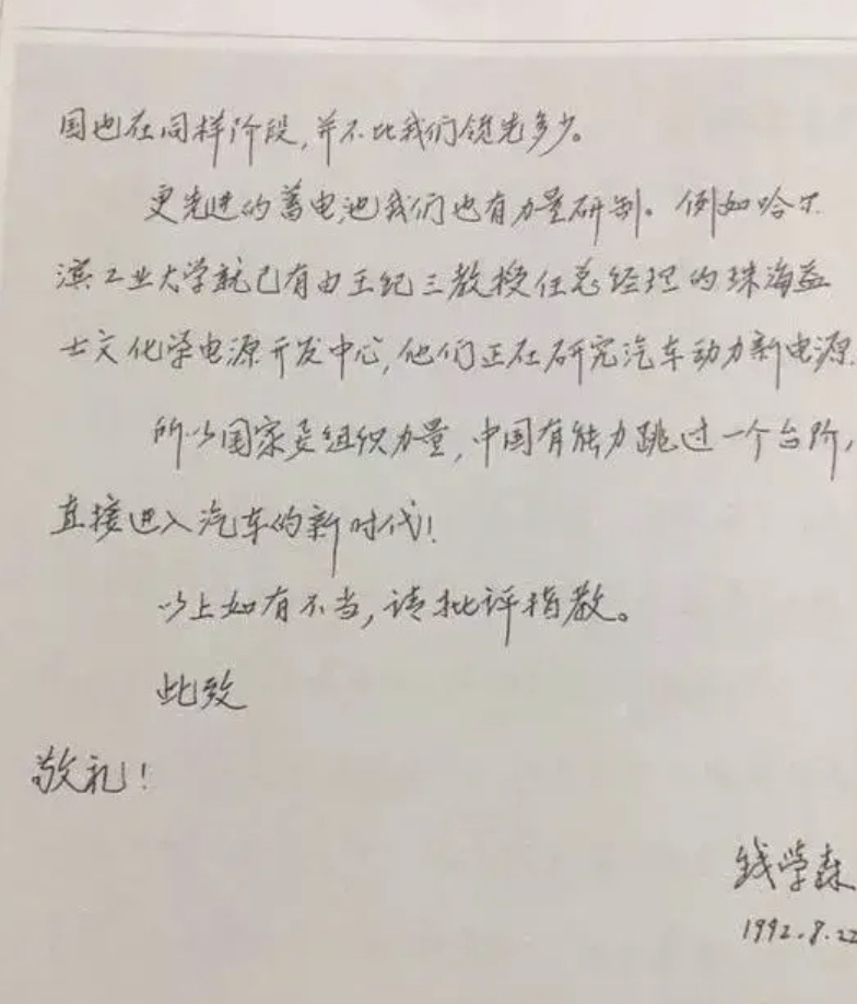 錢老的信是這麼寫的:“我國汽車工業應跳過用汽油柴油階段,直接進入減少環境污染的新能源階段,現在歐、美、日都在組織力量研究高效蓄電池,計劃開發出電動汽車,我們決不應再等待,要立即制訂蓄電池新能源的汽車計劃.迎頭趕上,力爭後來居上!”