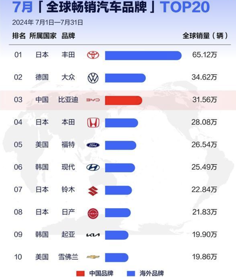 2024年八月,比亞迪汽車銷量373083輛,比亞迪在全世界的銷量,也來到了世界第三,僅次於豐田和大眾。比亞迪員工超過70萬人,比亞迪2023年校招總人數達到3.18萬人次,其中碩士和博士整體佔比達61.3%,研發人員佔比高達80.8%……比亞迪是全產業鏈企業,幾乎所有的關鍵技術和零部件都是在國內生產的。在電池、電控、電機、以及混動領域,可以説是真正領先世界。
