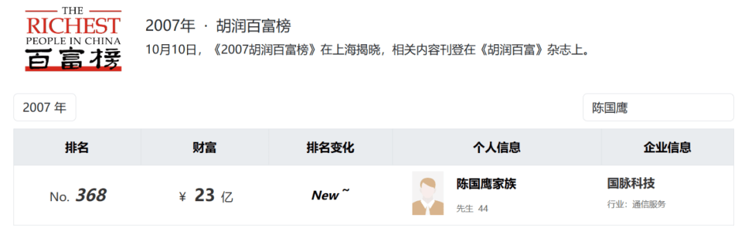 2006年,國脈科技在深交所上市,並一舉摘得“中國電信外包服務第一股”桂冠。也因此,2007年,陳國鷹的名字首登《胡潤百富榜》,如今,隨着慧翰股份的成功上市,其身價勢必將大幅增長。