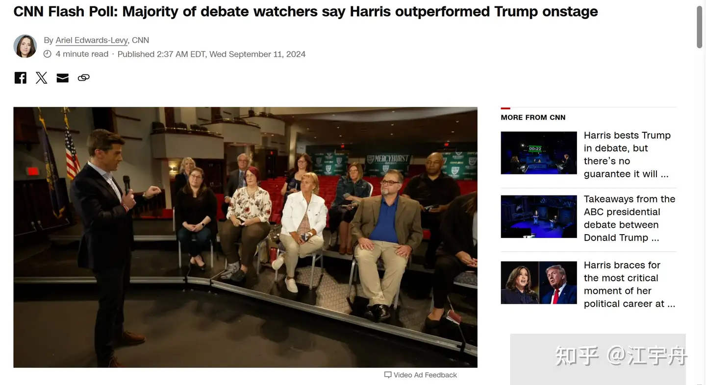 而且説雙方得票比是63:37。在獨立人士的選民中,哈里斯的支持率在辯論後上升到48%,高於之前的30%。