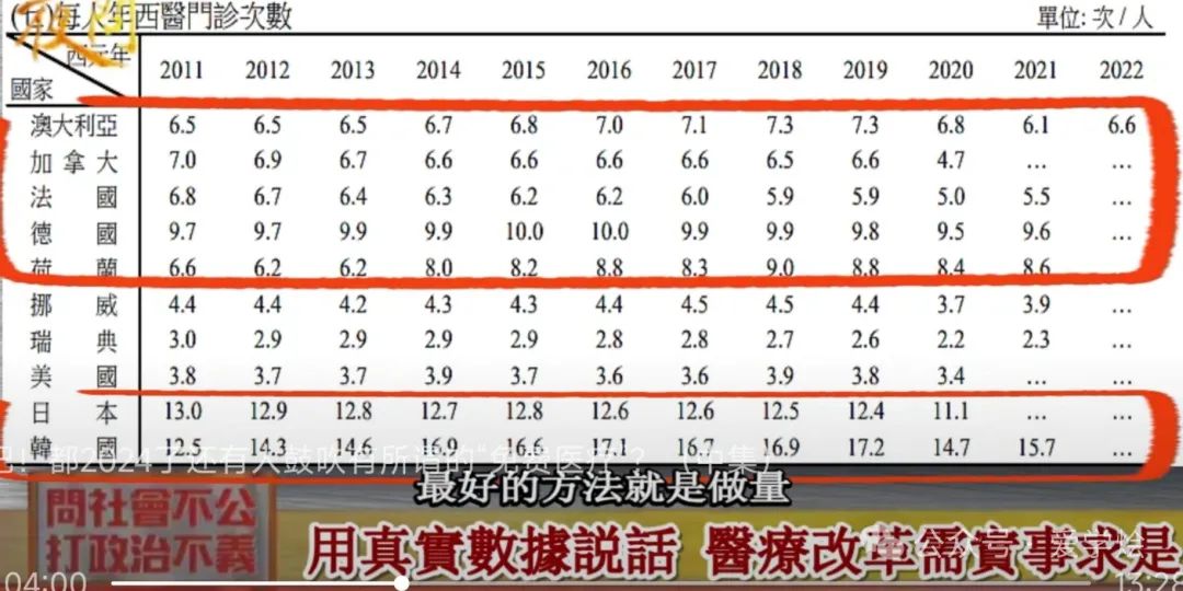 從她的表中看出,年人均就診次數,有好幾個國家都比中國的7次高不少,用這樣直接的數據證明李玲教授的所説是錯的,而且,她錯的還很無知。