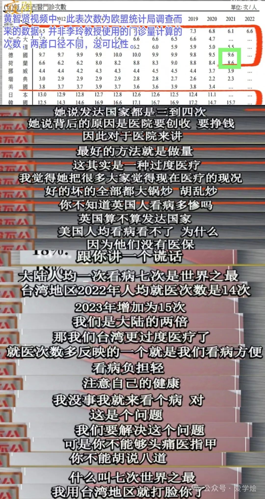 第一個例子,中國人年均看病7次,是世界之最,黃智賢用數據打臉李玲教授。