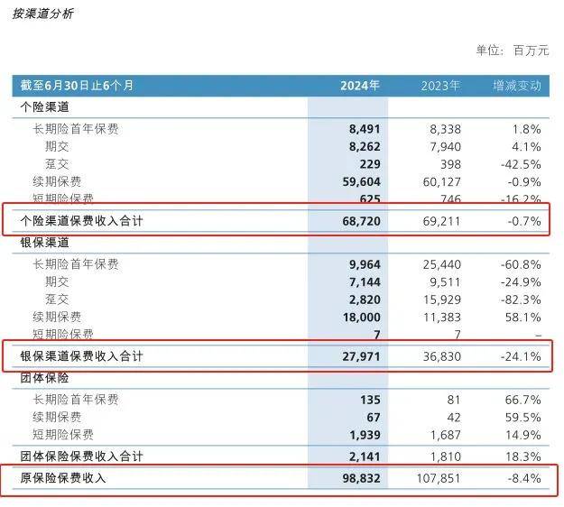 今年上半年,該渠道保費收入合計為279.71億元,同比下降24.1%,主要是長期險首年保費同比降幅較大,降幅為60.8%;銀保渠道躉交保費的下降82.3%。銀保渠道續期保費同比增長58.1%至180億元。