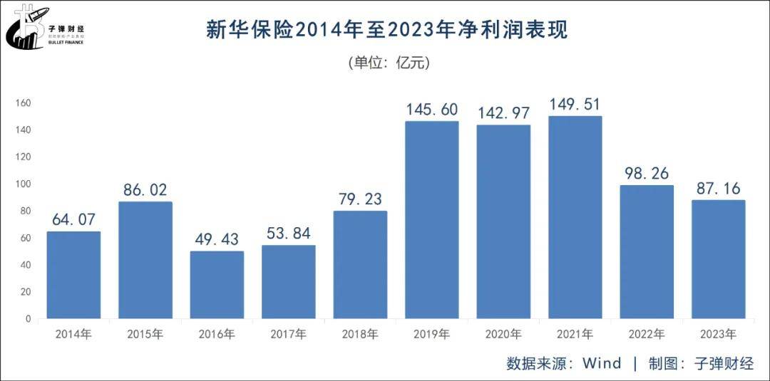 淨利潤表現也難言樂觀,歷年年報數據顯示,2019年至2022年,新華保險淨利潤分別為145.6億元、142.97億元、149.51億元和98.26億元。2023年,新華保險實現淨利潤87.16億元,盈利水平不及5年前。