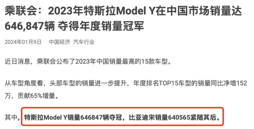 乘聯會數據顯示,2023年,特斯拉Model Y在中國市場銷量達646847輛,奪得年度車型銷量冠軍。