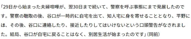 二人便小矛盾不斷,到4月30日,甚至吵到把警察引來了。隨後谷口賢志去了朋友家,二人分居。