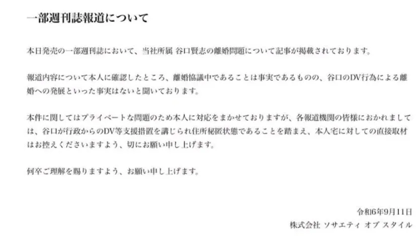 下午4點多,谷口賢志所在的公司稱,谷口賢志方面由於現在正在處於“家暴保護狀態”所以沒辦法接受採訪。