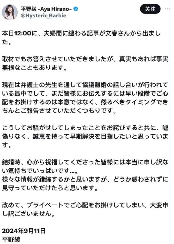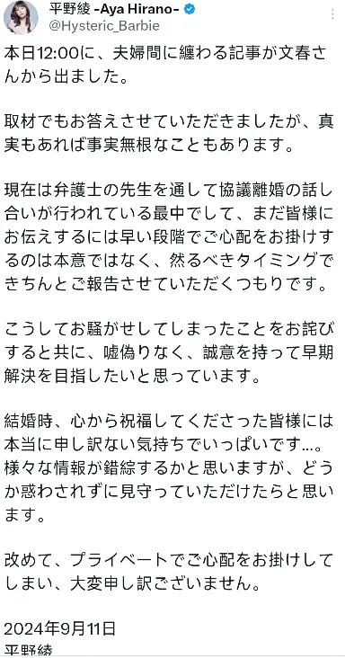 平野綾發推表示,今天中午文春發的那個新聞,有可信的也有沒有證據不太可信的,不過兩人確實在協商離婚的事情。