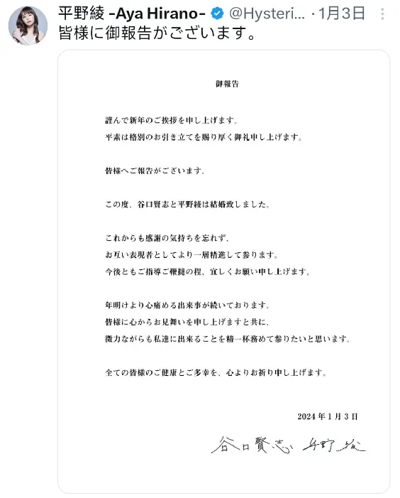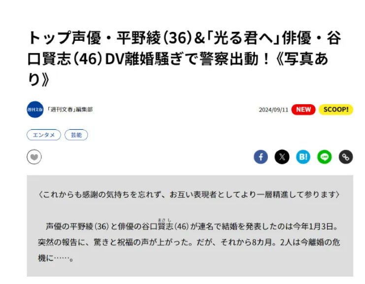 文春社報道:頂級聲優平野綾與演員谷口賢志協議離婚,二人涉嫌家暴導致警方出動!_風聞