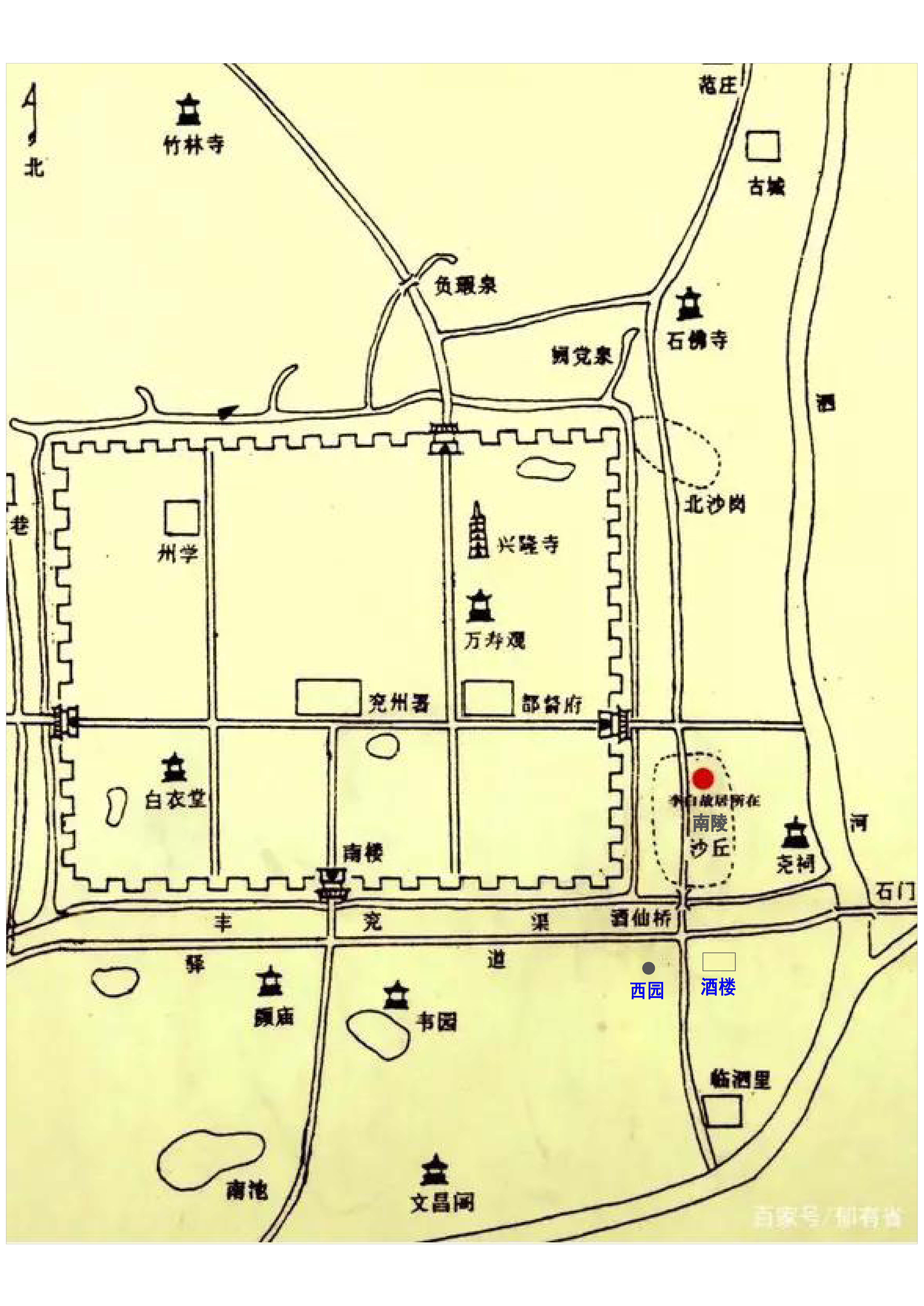 武秀2024.9.7微信:“兗州李白經現場踏勘,尋訪原住民。老譜不存,祖輩口傳:瑕丘城東有兩個沙丘,體積很大,為史上大水沖積而成。南邊稱南崗子,北邊稱北崗子。後住人,成了街。南沙丘即南崗子街又南陵。北沙丘即北崗子街又北陵。李白寓居南沙丘即南崗子街又南陵。南者,相對北陵稱之。陵者,大阜也。謂之南陵。”又曰:“明萬曆年間(1573-1619)于慎行《兗州府志》載:“沙丘,在宗魯門外。兗州府城(瑕丘)城樓有四:北曰鎮岱、南曰延薰、西曰望京、東曰宗魯。”或者宗魯門即東魯門。東長相似宗,繁體“東”之印刷錯誤。南陵瑕丘沙丘位置見圖8。