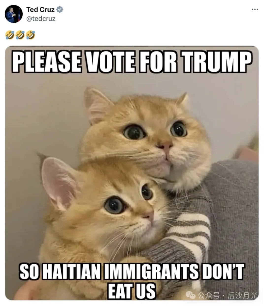 有人聲稱親眼看到海地移民將貓肉掛在樹枝上,特朗普團隊就在X上聲稱:“特朗普總統將趕走吃寵物的移民,而哈里斯會把這些人送到你的城鎮。做出你的選擇吧,美國人。”