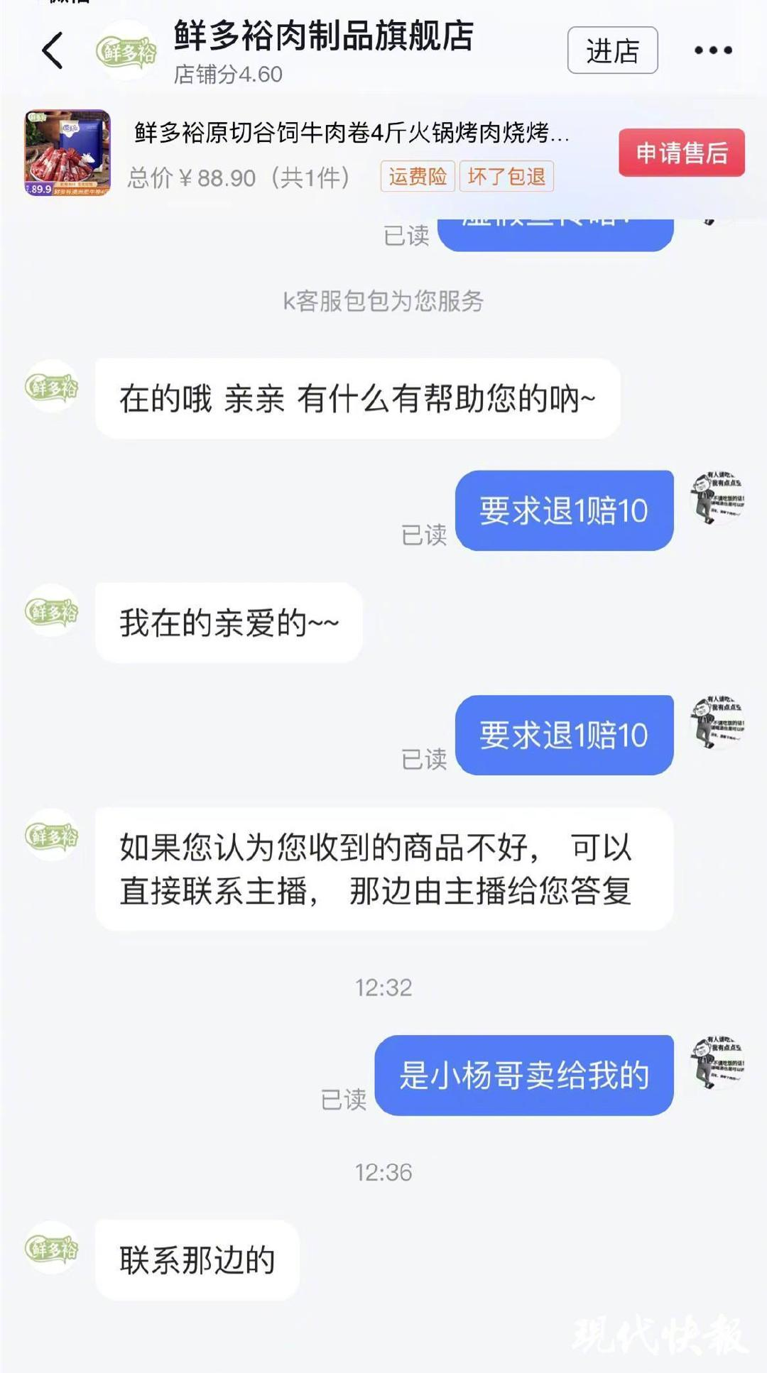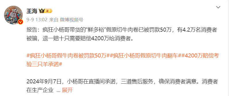 説他帶貨的 “ 鮮多裕 ” 牛肉卷被認定不是原切牛肉,已經有 4.2 萬名消費者被騙,讓小楊哥趕緊出來退一賠十,準備好 4200 萬吧。