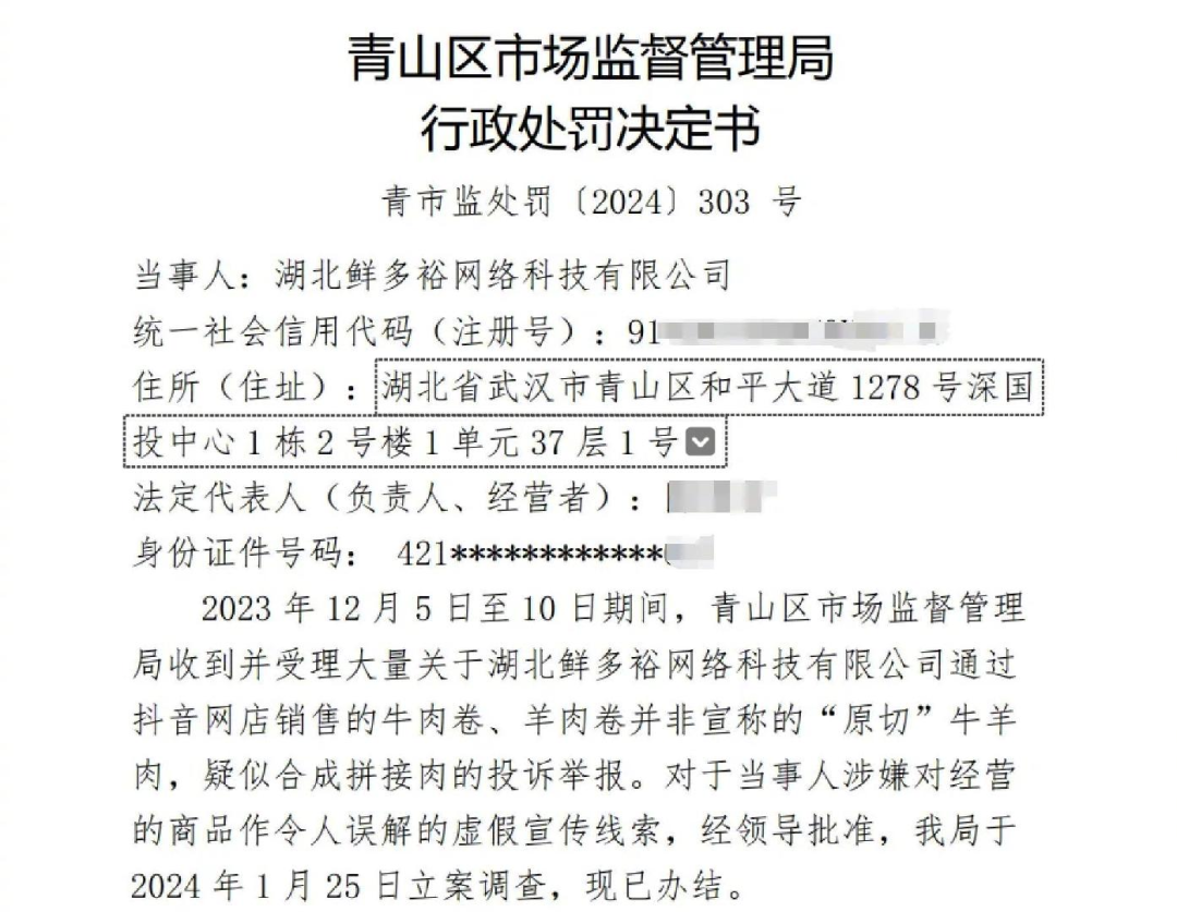 青山區的市場監督管理局對此回應説,這家牛肉的生產商,確實已經被罰了 50 萬。