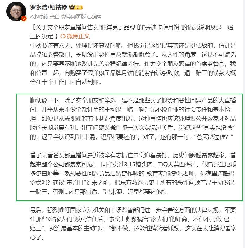 就像羅永浩在微博裏説的,嘴上喊着 “ 家人們 ” ,最後別説假一賠十,有些人連賠一可能都做不到。轉頭還能笑着來賺家人的錢。