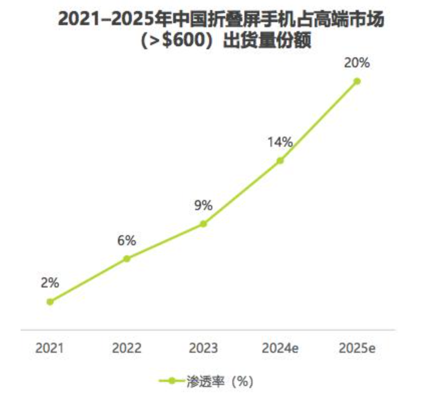 從宏觀數據來看,近幾年摺疊屏銷量呈現快速上升趨勢,在高端機市場的份額也不斷提升,已進入快速滲透階段,今年應該能達到14%,預計到2025年底達到20%的水平。
