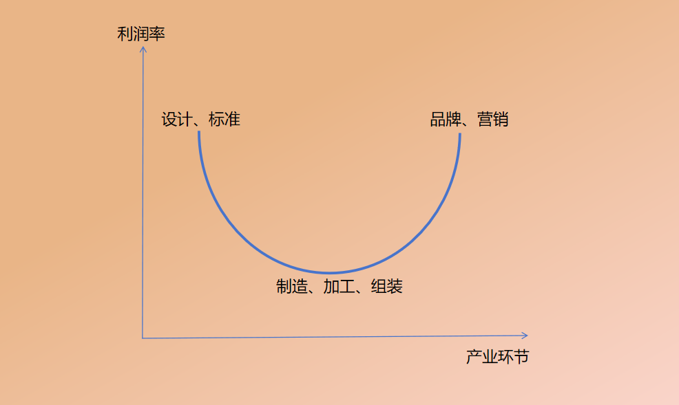 經濟學上有“微笑曲線”的説法,意思是,一個產業、一個產品的利潤率,在起初的原創性研發、標準制定這些方面,是很高的;但在中間的製造、加工、組裝這些方面,就會被壓得比較低;然後到了後期的品牌塑造、營銷這些方面,又比較高了。把各環節利潤按高低畫在紙上,就會出現兩邊高,中間低的樣子,就好像簡筆畫的微笑一樣。