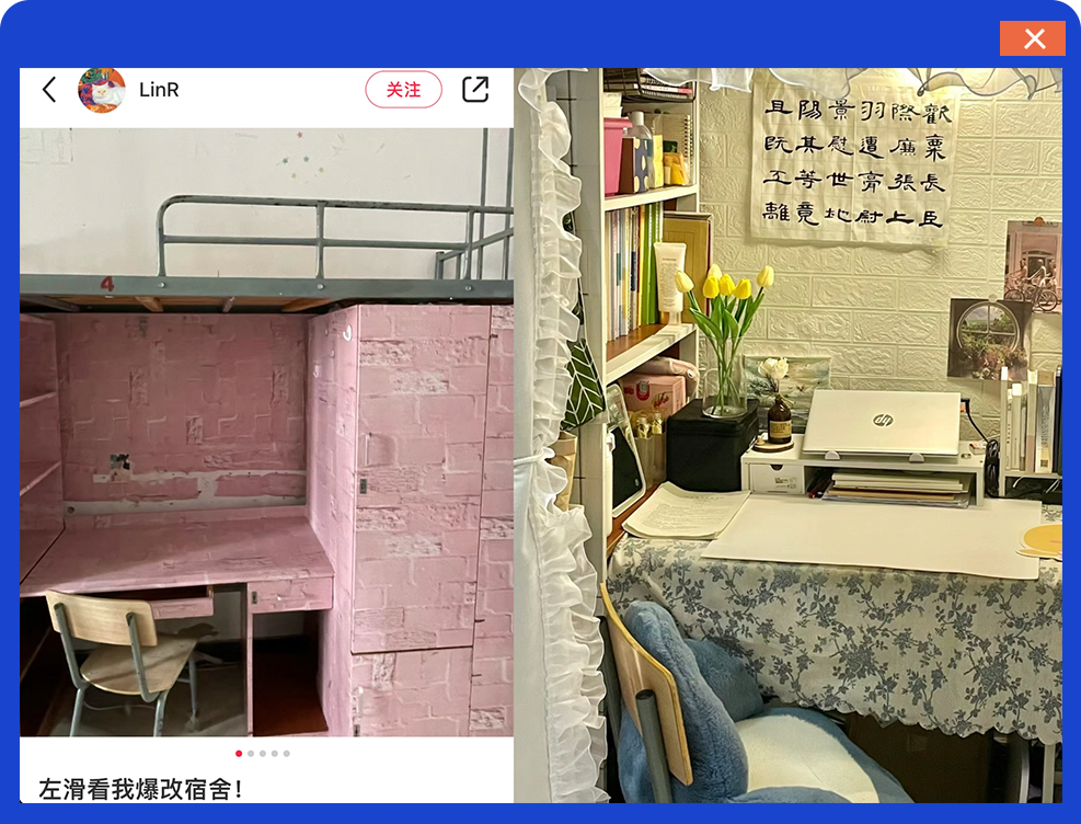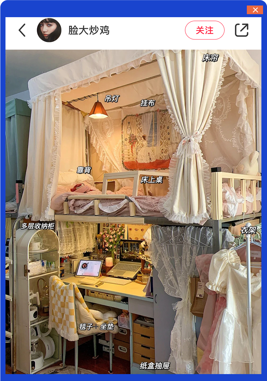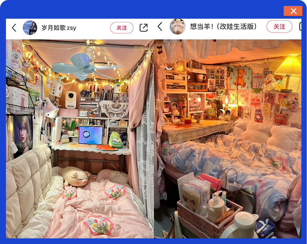 毛絨娃娃、甜美掛畫裝點到每一個精緻細節,戰損宿舍變華麗卧室。