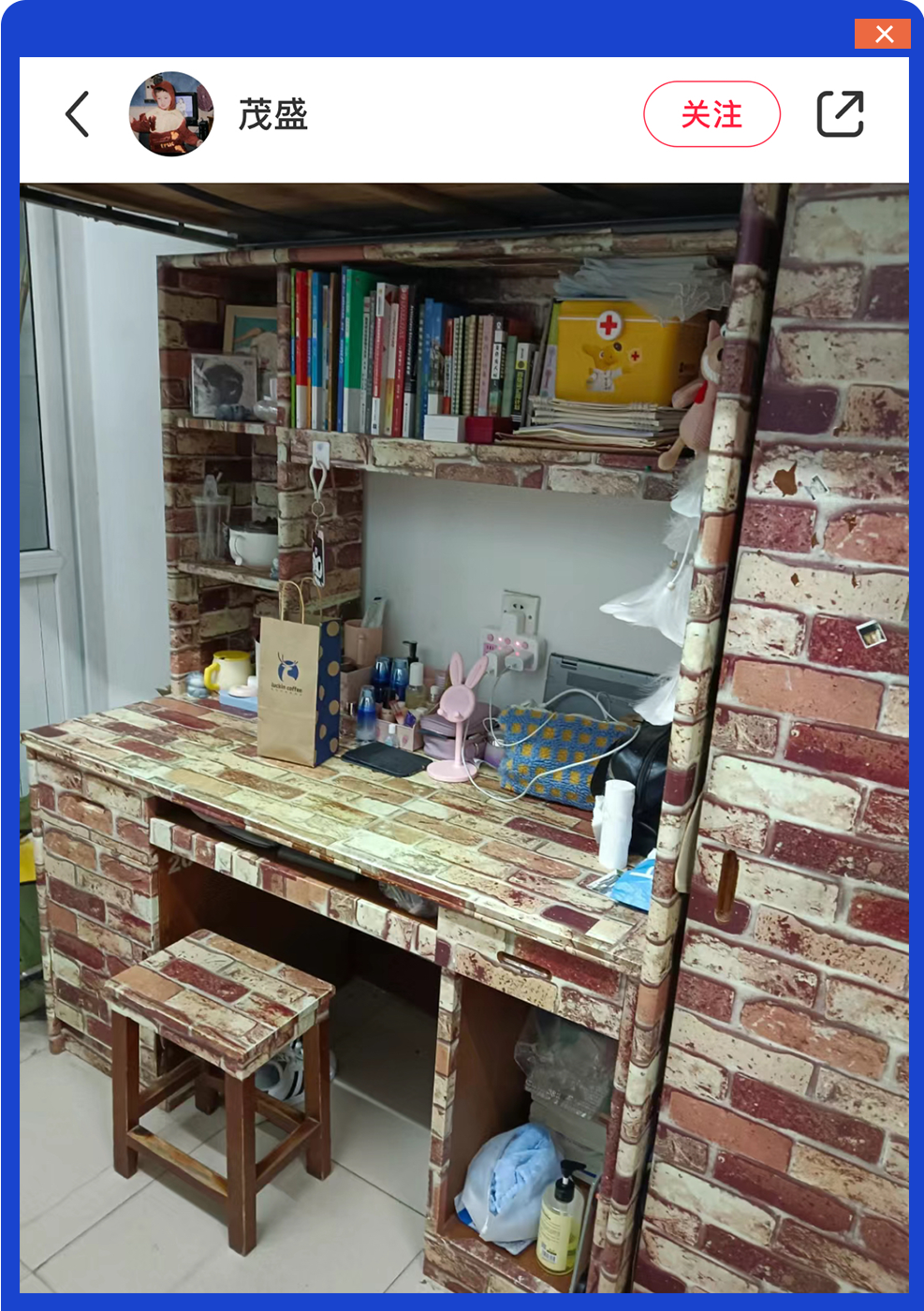 區區一張桌子還不夠發揮,努力的人會把整個宿舍變成古樸的紅磚毛坯房。