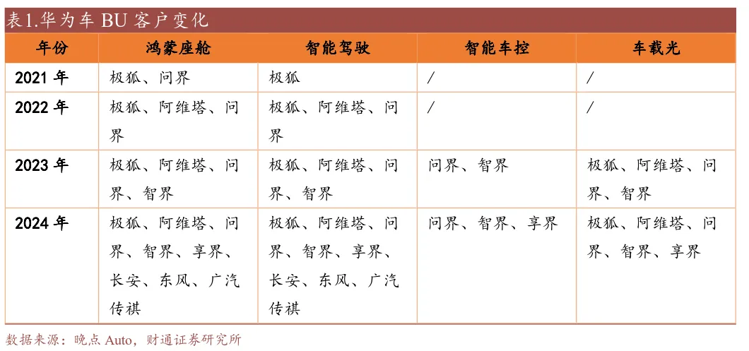 根據華為官方,車BU目前共有五大解決方案,包括汽車智能駕駛解決方案、智能座艙、智能汽車數字平台、智能車雲、AR-HUD與智能車燈。目前華為智能駕駛客户包括極狐、阿維塔、問界、智界、享界、長安、東風、廣汽傳祺等。