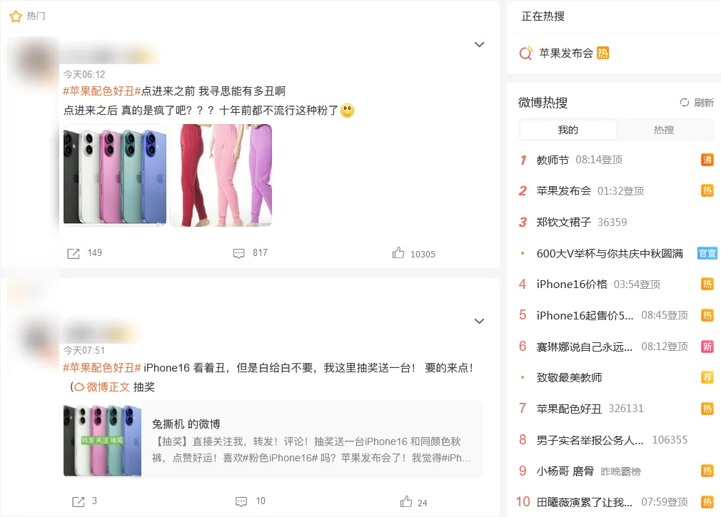 令人啼笑皆非的是,蘋果發佈會霸榜後,最先登榜的發佈會內容是**“蘋果配色好醜”。**