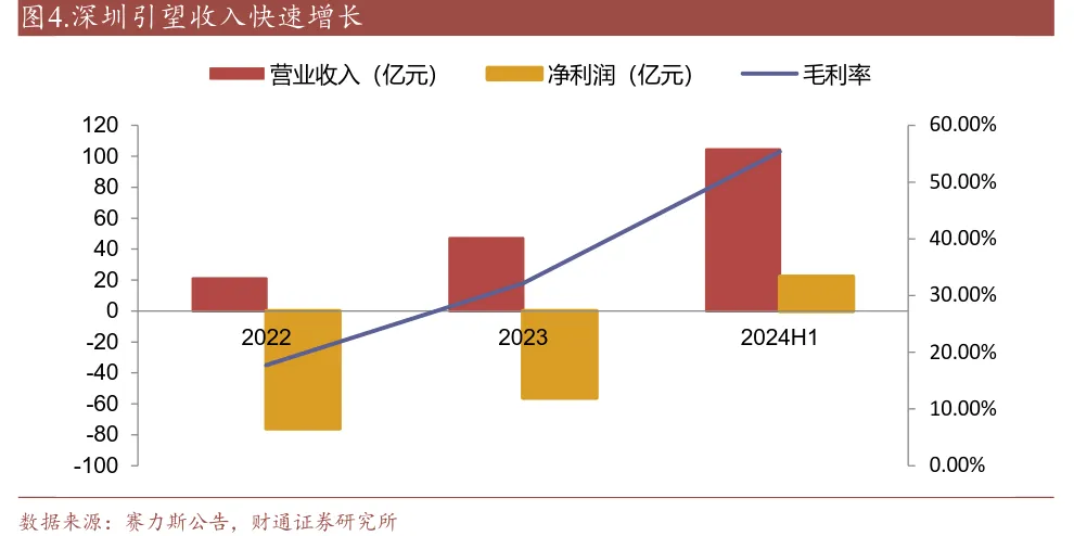 關於深圳引望的盈利能力,根據賽力斯發佈公告中,大信會計師事務所(特殊普通合夥)出具的深圳引望2022年至2024上半年的模擬財務報表。深圳引望2022年至2024年上半年的營業收入分別為20.98億元、47億元和104.35億元,主營業務毛利率分別為17.73%、32.13%和55.36%。2022至2024年上半年歸母淨利潤分別為-75.87億元、-55.97億元和22.31億元,淨利潤從虧損逐步轉為盈利。