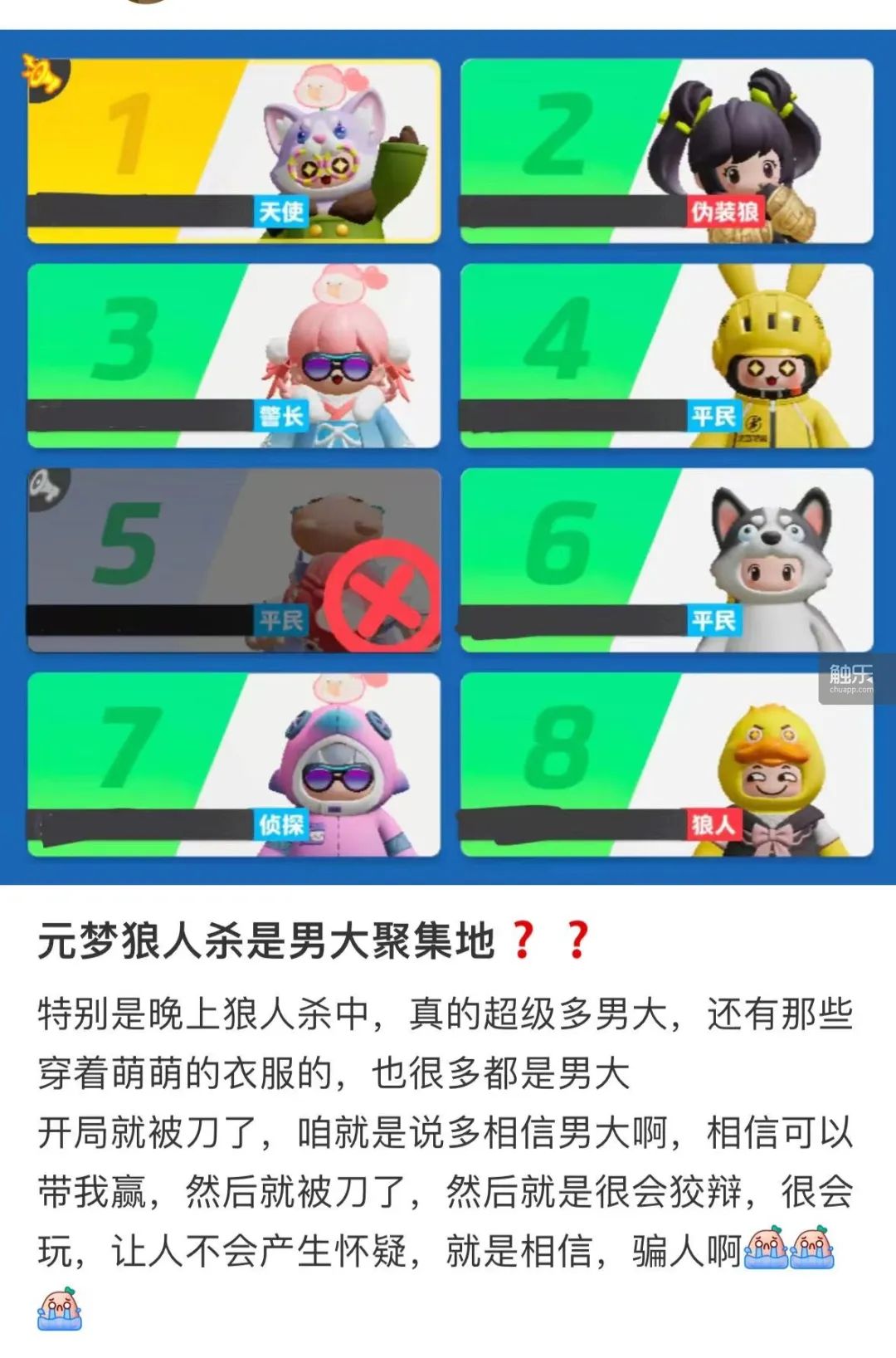 比如,曾一時引爆小紅書女性玩家的“深夜男大狼人殺”就是來自《元夢之星》的“誰是狼人”模式。這項玩法在傳統競技性之外填充了社交性設計,不那麼硬核、也不給人太大壓力。玩家在局內通過一些小動作,像是吃飯、吃藥、滅煙甚至使用喇叭等等,自然而然能夠和其他人產生社交互動,而這些有趣的社交內容外溢,又能吸引更多同類玩家進入。