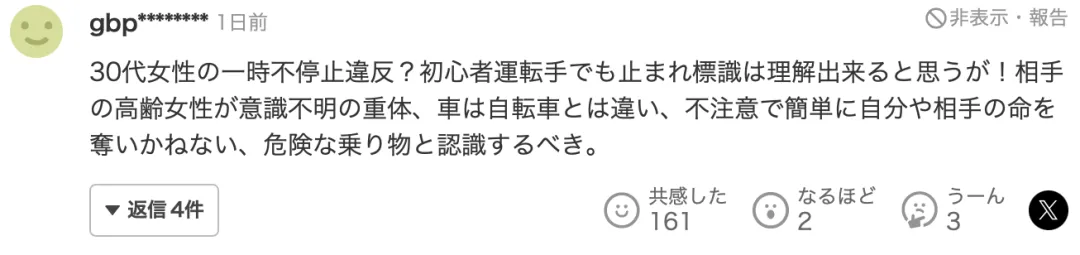 “30多歲女性違反標識不停車?我想新手司機也能理解停車標誌!對方是高齡女性,生命垂危,汽車和自行車不同,不小心就會奪走自己和對方的生命,應該認識到這是危險的交通工具。”