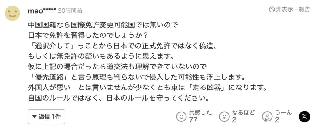 “如果是中國國籍,就不是可以變更國際駕照的國家。你在日本學會駕照了嗎?因為“通過翻譯”,所以不是在日本的正式駕照,而是偽造的。或者也有無照的嫌疑。如果是上述情況,因為不懂道路交通法也有可能是在不明白“優先道路”的原理的情況下侵入的。雖然不能説外國人不好,但至少汽車是“行駛的兇器”。請遵守日本的規則,而不是本國的規則。”