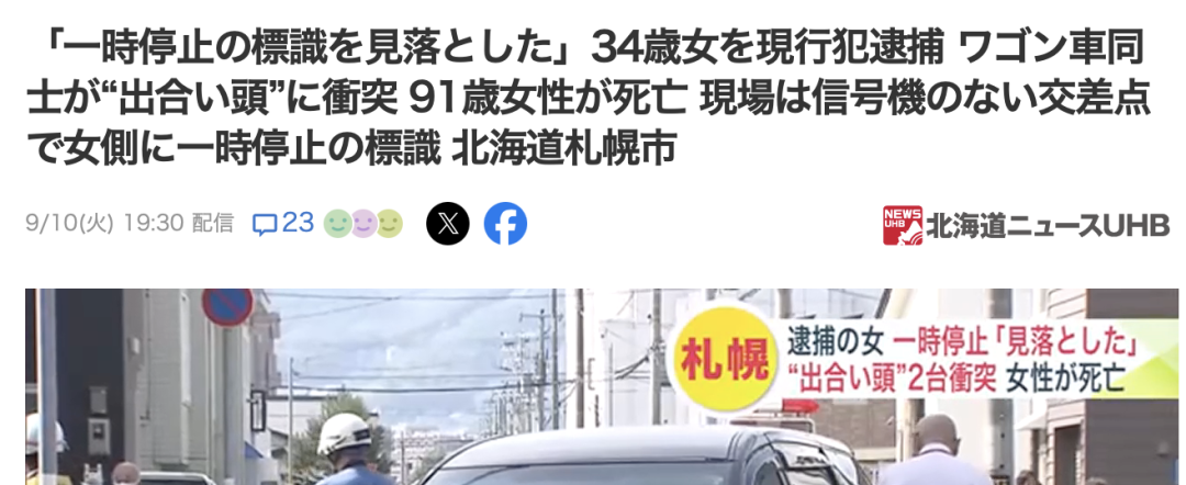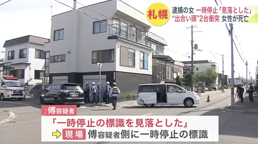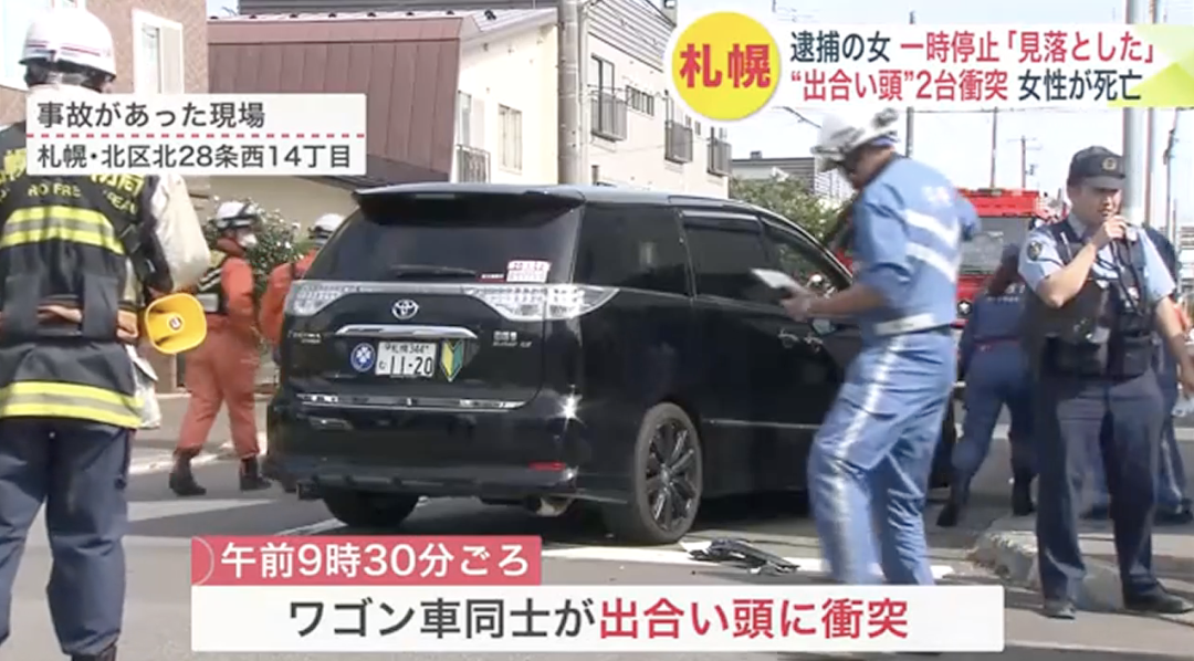 我們先來看一下事件的前後經過。9月10日上午,在札幌市北區的十字路口,一輛黑色轎車與一輛白色麪包車迎頭相撞,造成一名女性死亡,另外兩名女性受傷。