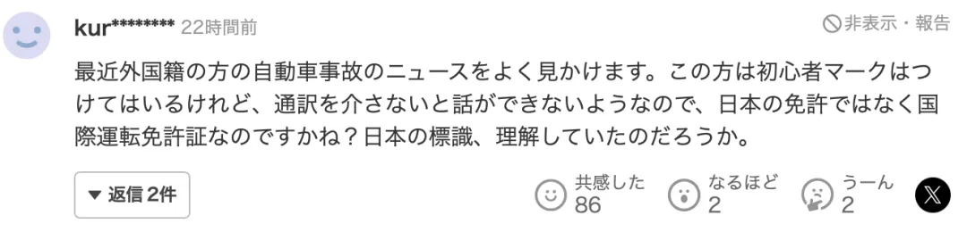 “最近經常看到外國人發生交通事故的新聞。這位雖然戴着新手標誌,但好像不通過翻譯就無法説話,所以不是日本駕照而是國際駕照吧?她理解日本的標誌了嗎?”