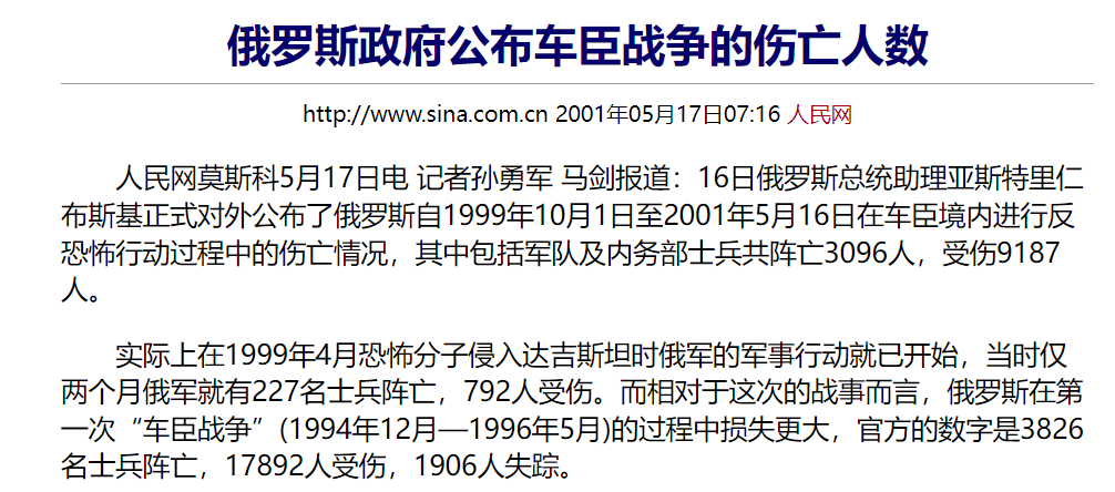 當然,第二次車臣戰爭雖然名義上在2001年1月22日普京宣佈俄軍全面從車臣撤軍就算結束了,不過車臣各種游擊戰和恐怖襲擊一直持續到2009年才基本結束,因此實際陣亡不止3096人。