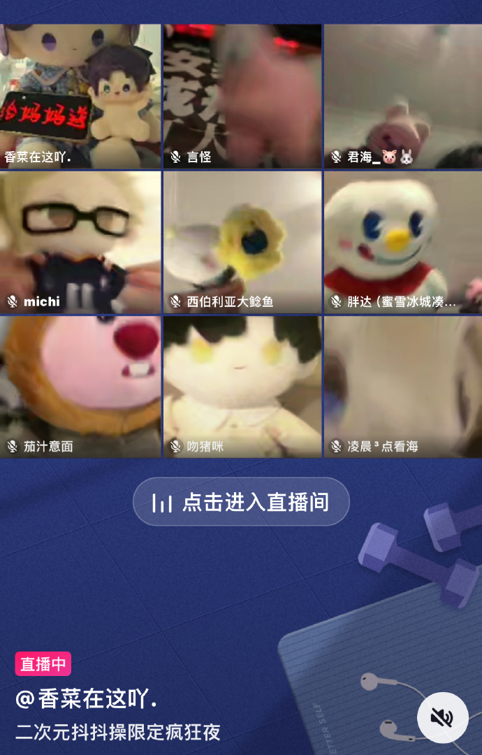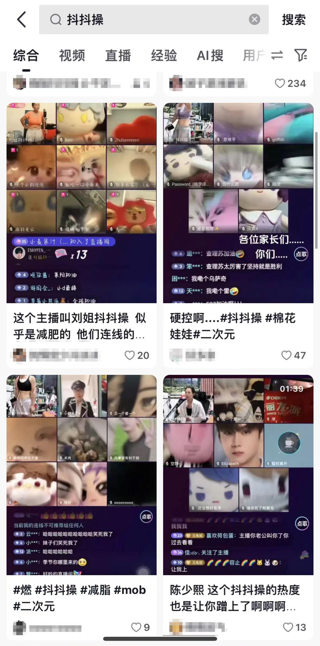 開玩笑的,這些連麥對象真身都是一個個不足巴掌大小的棉花娃娃,“小鼻嘎”們踩着鼓點的激情舞姿都是靠着“娃媽”那驚人的臂力和持久力。也不知道是哪位二次元網友率先意外闖入了中年人的世界,反正中年阿姨跳健身操和動漫角色玩偶同屏的奇景已然成為搜索“抖抖操”的主要推送內容,而相關直播的切片在加上ACG要素標籤後也傳播得越發廣泛。