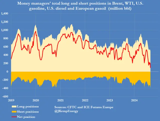 據能源領域專家John Kemp,在截至9月3日的七天內,對沖基金和其他基金經理在六種最重要的期貨和期權合約中賣出了相當於1.17億桶的原油。總持倉量降至僅9300萬桶,為至少十年來的最低水平。