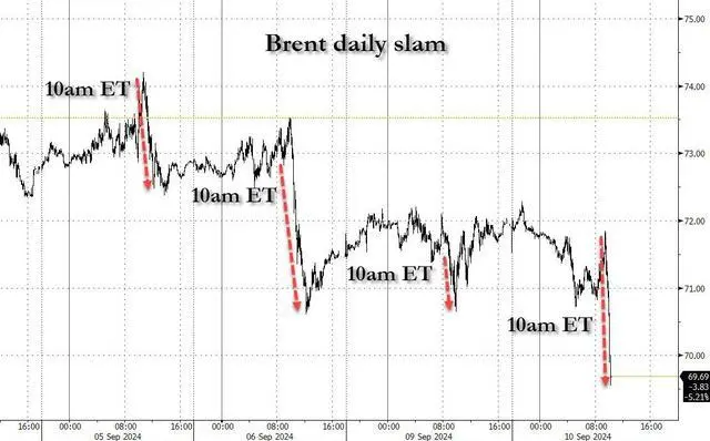 財經金融博客Zerohedge發現,近來每天,油價在美東時間上午10點都會有一波下跌。