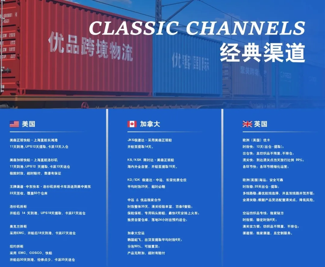 優品跨境物流擁有國際空運、海運、陸運、鐵路等數十種跨境物流解決方案,同時還專業提供亞馬遜退件進口、出口退税等跨境電商解決方案,優品作為國家批准的一級貨運代理企業,常年穩定且保持時效極限,在海外多個國家擁有自營倉庫,運輸,派送環節無縫銜接,UPS定點上門提貨,自有卡車送貨,安全高效等,且紡織品不限量,不排倉。