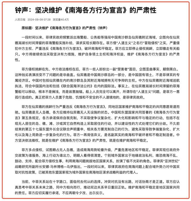 9月9日,《人民日報》刊登了“鐘聲”的署名文章,題目為《堅決維護<南海各方行為宣言>的嚴肅性》,其中陳述了菲律賓一段時間以來,頻繁派出海警船和公務船在中國南海挑釁的事實,指出其企圖非法滯留在仙賓礁潟湖,以及謀求長期非法存在的意圖。要求菲律賓立即停止侵權挑釁,立即撤走有關船隻。