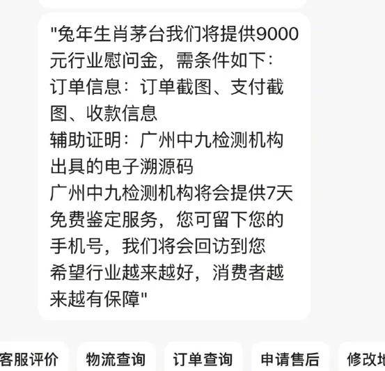 兔年生肖茅台的行業慰問金標準為9000元,除了基礎的訂單、付款信息外,還需要提供檢測機構給出的電子溯源碼等。