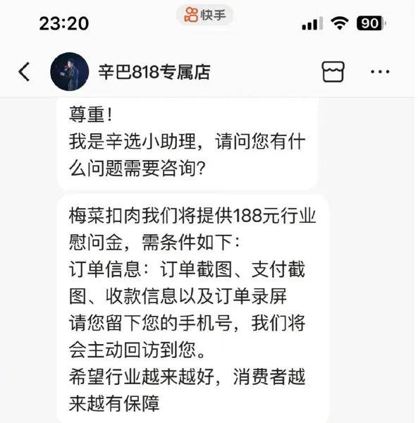 那麼賠付標準是什麼呢?根據客服提供的信息,這筆賠付款被辛選官方定義為行業慰問金,其中梅菜扣肉為188元,需要消費者提供訂單截圖、支付截圖、收款信息及訂單錄屏等。