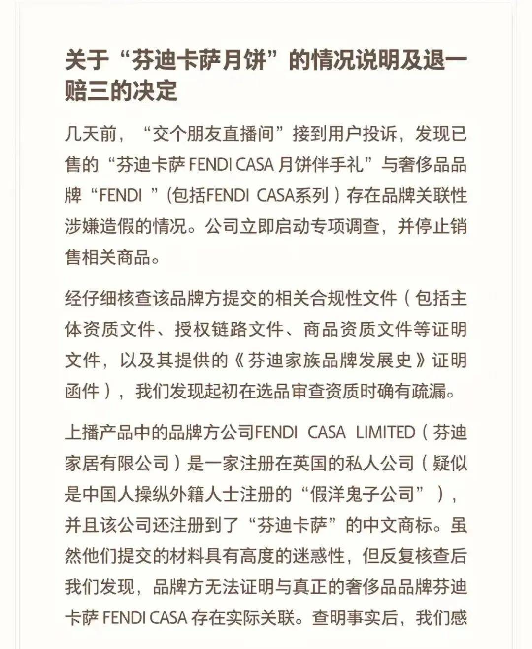 事情大概是,8月上旬,交個朋友發佈預告,稱將帶貨芬迪月餅禮盒。