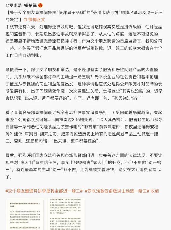 此外,羅永浩也公開表示,他和公司一起,向購買了「芬迪卡薩月餅」的消費者誠摯致歉,退一賠三的錢款大概會在十個工作日內自動到賬。