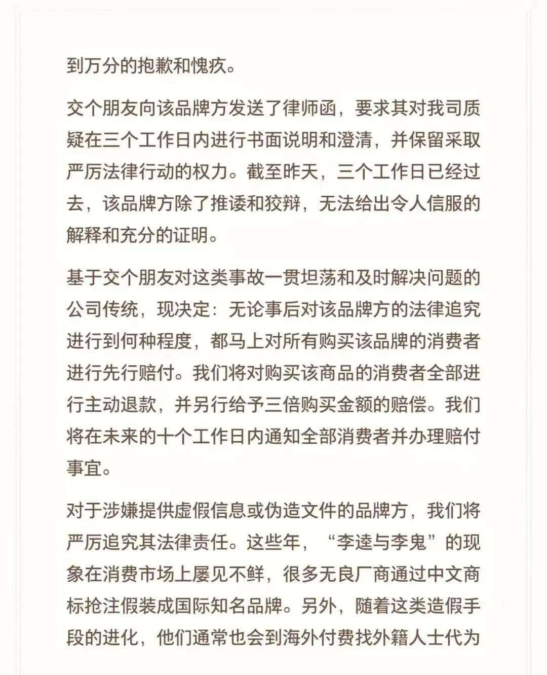 交個朋友也是第一時間啓動調查,不調查不知道,一調查嚇一跳,果然翻車了。