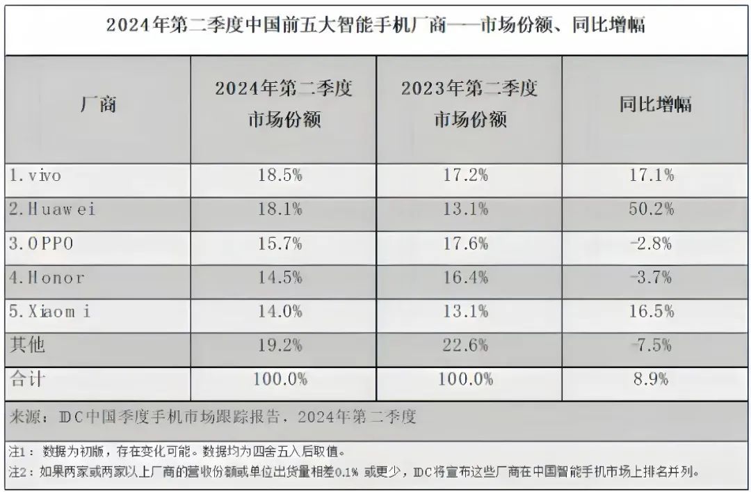 然而在此之後,榮耀的市場份額並沒有實現節節攀升,反而出現萎縮的跡象。IDC發佈的中國季度手機市場跟蹤報告顯示,2024年第二季度,中國智能手機市場出貨量約7158萬台,同比增長8.9%。其中,榮耀以14.5%的市場份額位居第四名,同比增幅為-3.7%。值得一提的是,vivo和華為包攬了前兩名,市場份額分別為18.5%和18.1%,同比增幅達到17.1%和50.2%。