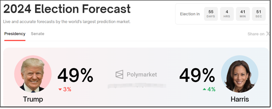 只不過這場電視交鋒之後,特朗普和哈里斯基本是站在同一起跑線上,雙方勝負都是五五開。