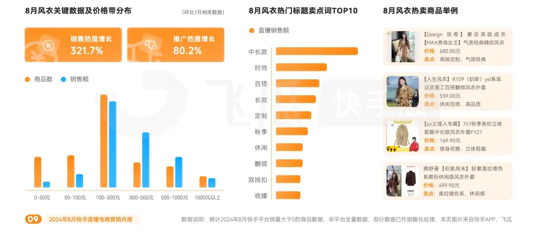 隨着天氣日漸涼爽,早秋場景悄然帶動了秋裝服飾的增長曲線。在這一波銷售熱潮中,風衣8月銷售熱度環比上月增長321.7%,增勢強勁。其中,100-300元價格區間的風衣最受消費者青睞,不僅滿足了大眾對於時尚與品質的追求,也體現了高性價比的購物趨勢。