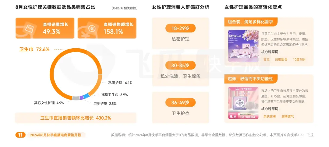 在獨立意識覺醒的趨勢下,現代女性更加關注自我的真實需求,越來越多的女性選擇直面隱私健康。其中,女性護理也在新經濟崛起的“她時代”下,得到了越來越多的關注和聲量。據飛瓜數據顯示,快手8月女性護理直播GMV環比上月抬升158.1%,其中衞生巾貢獻了超七成的銷售額。