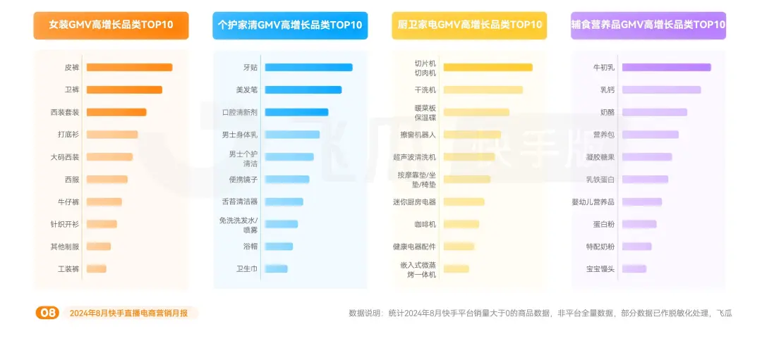 從品類增速來看,黃金、家裝建材、奢侈品三個類目在本月呈現出強勁的增長態勢,GMV和客單價均保持在三位數增長。同時,“換季經濟”也打開了生意增長突破口,皮褲、衞褲、打底衫等早秋服飾需求激增,身體乳、洗髮水等個護用品悄然起量。另外,818大促也帶動了多品類銷售增長,如切肉機、乾洗機、暖菜板等小電近期熱銷;牛初乳、乳鈣、奶酪衝上輔食營養品GMV高增長TOP3。